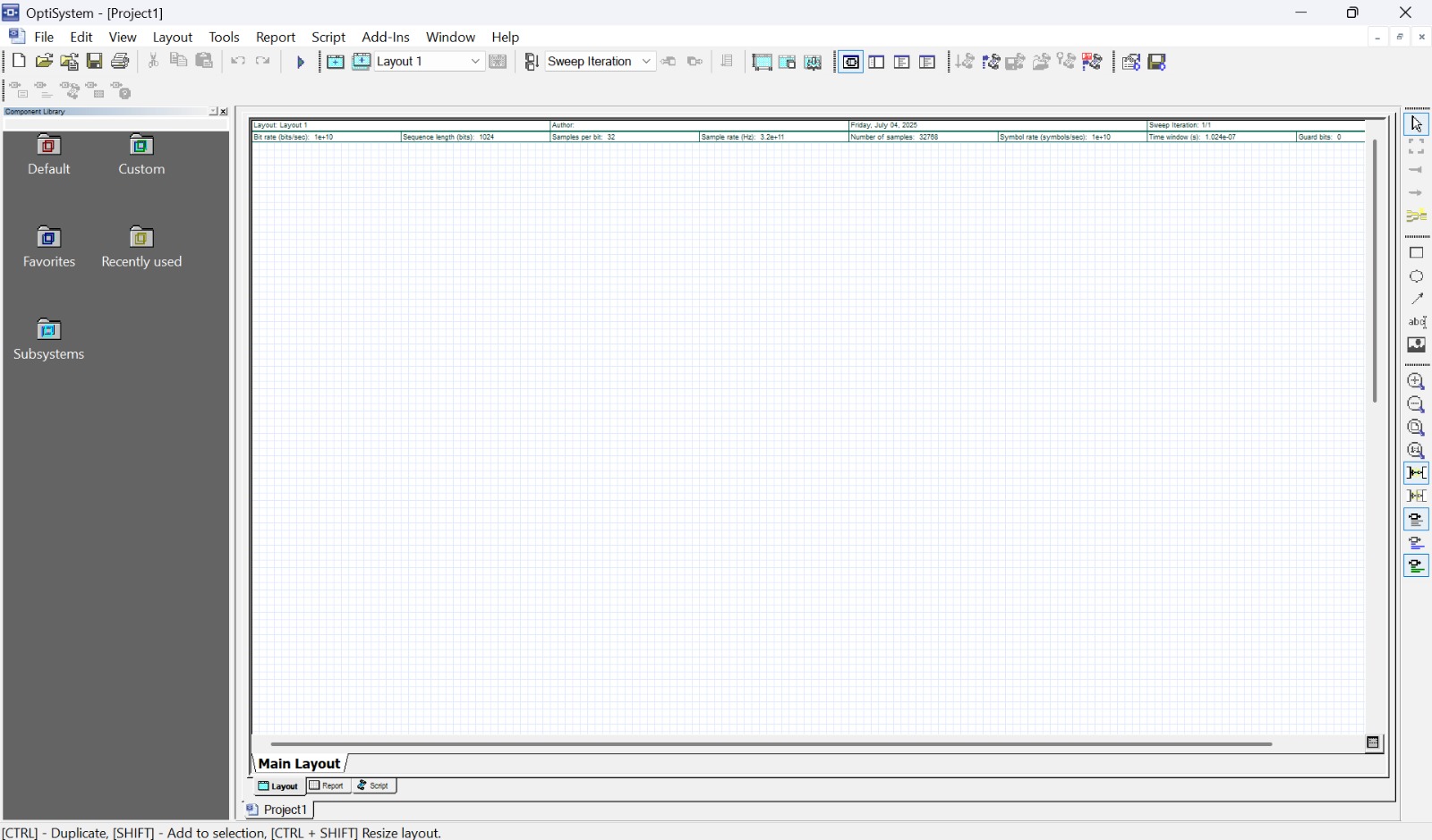 Para crear y simular los circuitos se utiliza el fondo en blanco que se nos proporciona (file). Para crear cada circuito, Optisystem tiene una sección dedicada expresamente a guardar y ordenar en carpetas distintas los componentes que componen dicho circuito. Este espacio sería el gris que se aprecia a la izquierda de la pantalla.