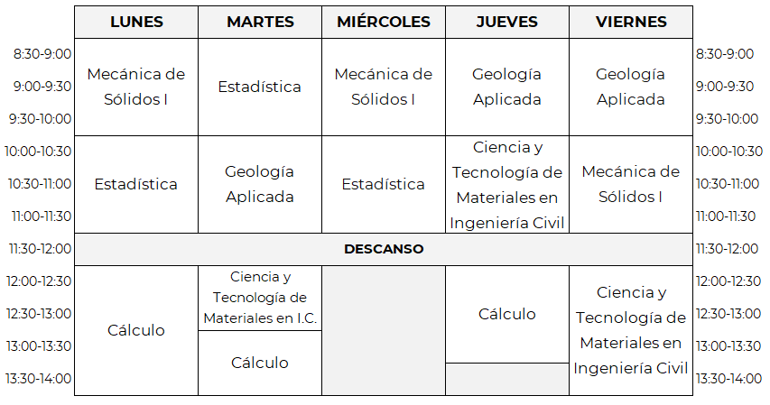Horarios de 2º de Grado en Ingeniería Civil y Territorial, primer cuatrimestre