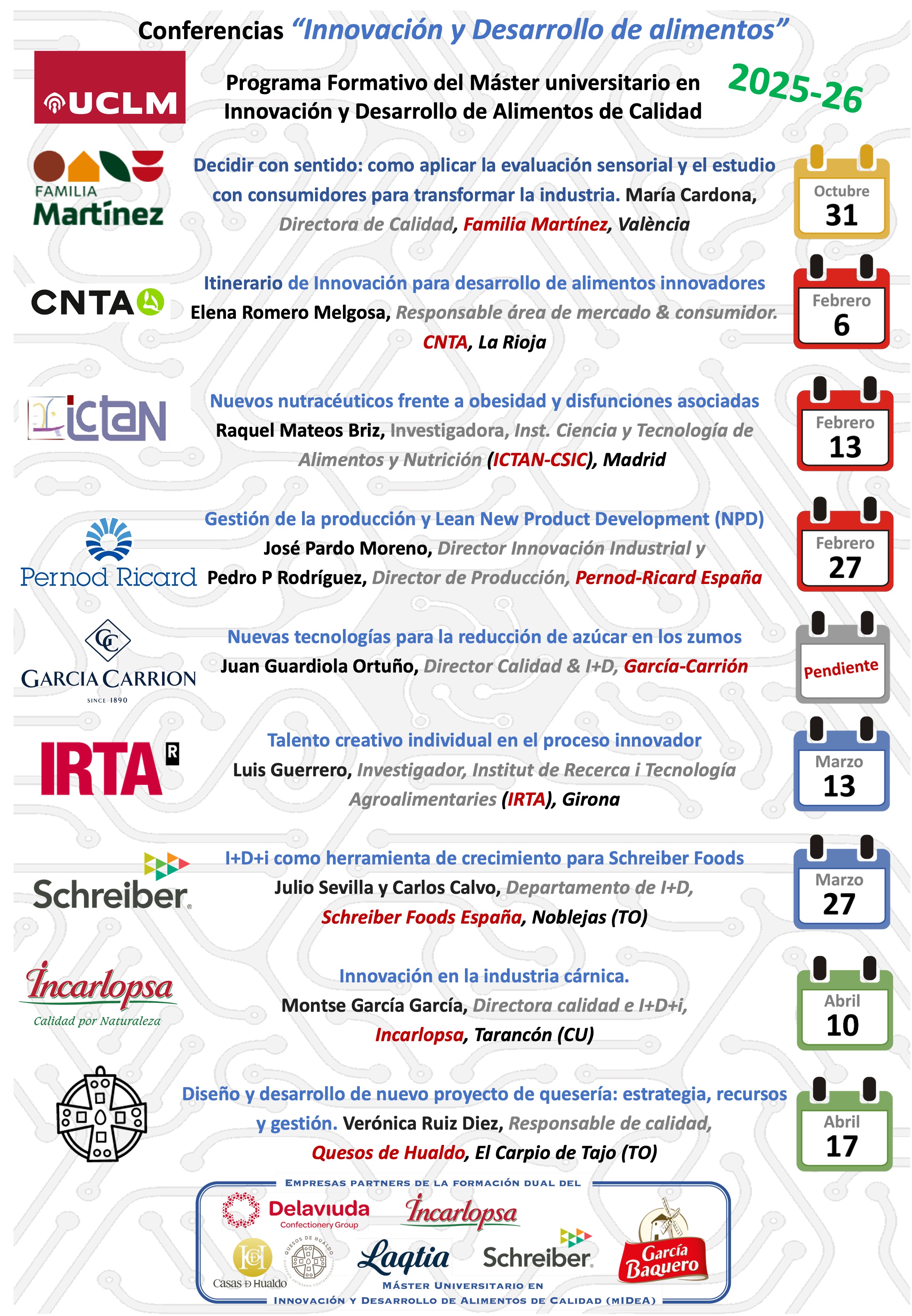 Actividades formativas dirigidas a los estudiantes del mIDeA pero ABIERTAS a las y los profesionales de las Empresas Alimentaria y del Sector de la Alimentación, egresados y estudiantes de CTA. ¡ Recibe información uniéndote al grupo en LinkedIN y siguiéndonos en Twitter #mIDeAuclm ! Por cuestiones de aforo es necesario apuntarse para poder asistir, enviando un correo a cta.quimicas.cr@uclm.es, indicando: «ASISTENCIA Conferencias mIDeA» en el asunto y nombre y apellidos, situación laboral y empresa, titulo y fecha de la conferencia en el texto del mensaje.